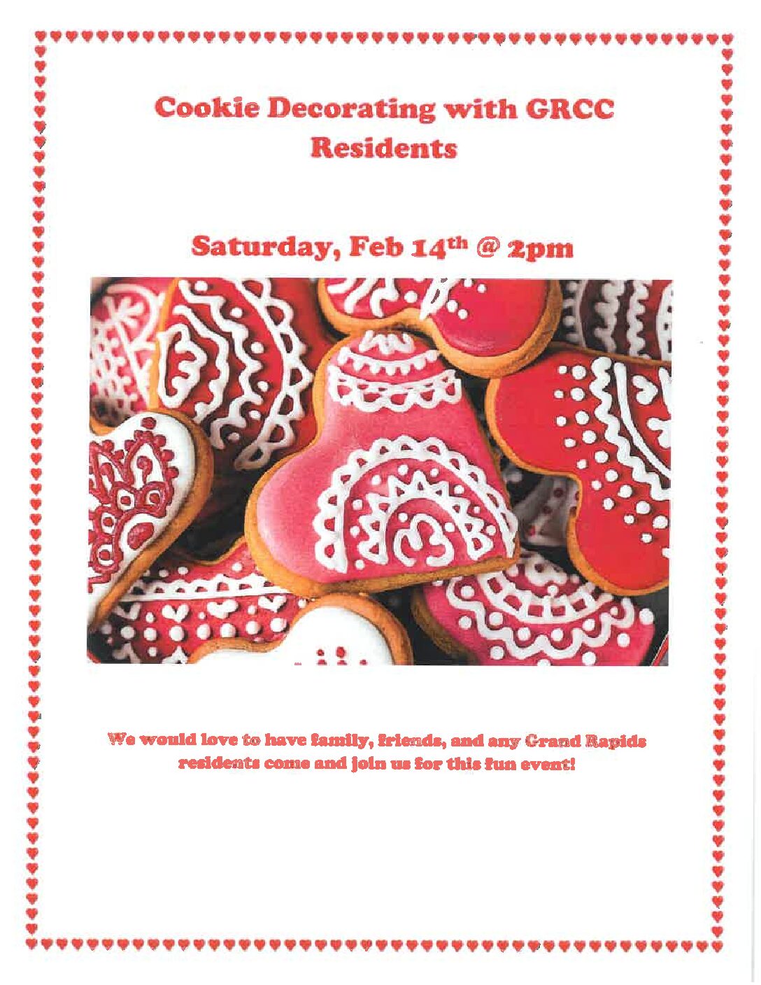 The Revitalizations Partners are proud to share this opportunity with you! Join us and the residents of our local Grand Rapids Care Center on Saturday, February 14th at 2pm to decorate Valentines cookies together! All supplies will be provided by the Partners, just bring your friends and family and spread (see what we did there?) some love. Not able to attend? Visit our local shoppes for a complimentary Valentines card to be delivered to the residents just before cookie decorating. We would like to give special thanks to Willow Child Care for hand making cards for the residents. So, follow your heart to Downtown Grand Rapids and share some Valentines love!