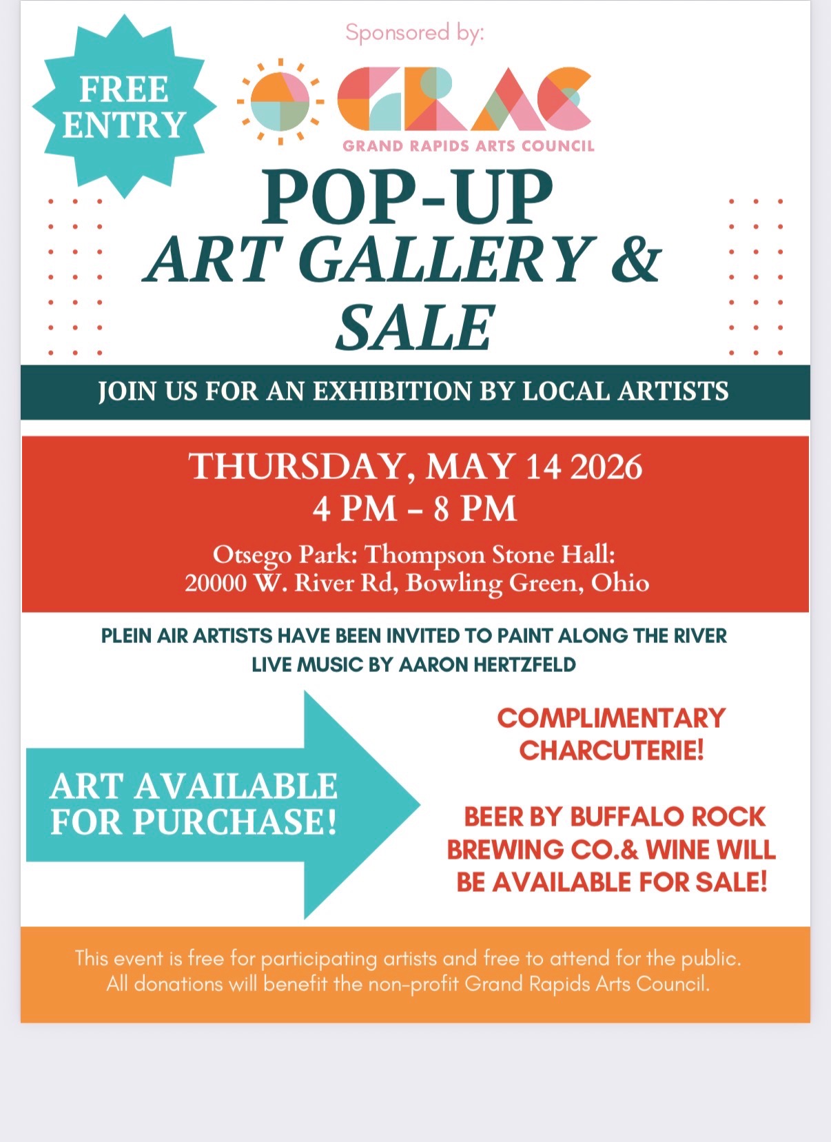 Join us for an exhibition by local artists. This is a free entry event for all. Regional artists have been invited to share/sell their work. Plein air artists have also been invited to paint along the river. Live music by Aaron Hertzfeld and complimentary charcuterie. Beer by Buffalo Rock Brewery Co. and wine will be...